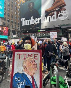کارگردان فیلم «اوج تا حضیض» (Highest 2 Lowest) که سالهاست از ترامپ انتقاد میکند، تابلویی با تصویری از شماره اخیر مجله «تایم» از ترامپ در دست داشت که در آن عبارت «وقت رفتن فرارسیده!» خوانده میشود. لی مینویسد: «برخیزید، بلند شوید، ملتفت شدید؟»