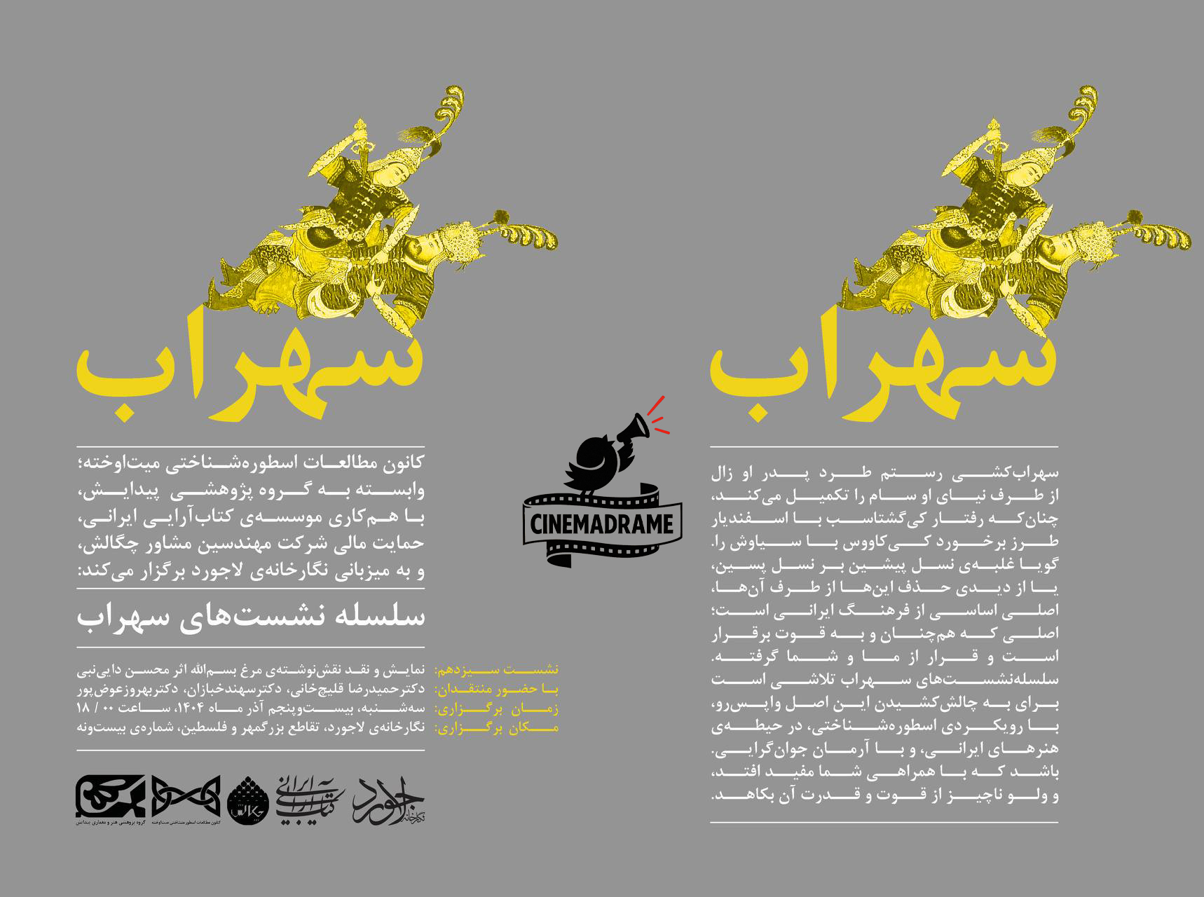 به گزارش آژانس خبری سینمادرام، کانون مطالعات اسطورهشناختی میتاوخته؛وابسته به گروه پژوهشی پیدایش، با همکاری موسسه کتابآرایی ایرانی، حمایت مالی شرکت مهندسین مشاور چگالش، و به میزبانی نگارخانهی لاجورد برگزار میکند.